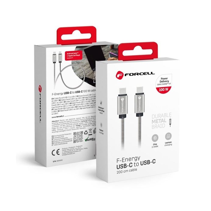 Cabo de Dados USB-C para USB-C FORCELL F-ENERGY Metal C239 PD QC4.0 5A 100W E-mark 2m